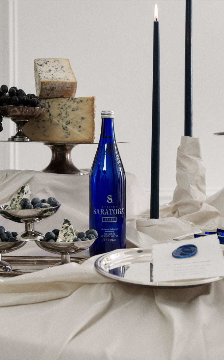 I am of the philosophy that everything your gaze touches should inspire, evoke, and enliven the senses. This philosophy is visibly evident when I’m setting a table. From the décor to the food, every element is thoughtfully considered to conjure emotion and above all, connection. So of course when Saratoga Spring Water asked me to design a table inspired by their cobalt blue bottle my creative mind started spinning with ideas. Because if you know me, you know I LOVE a theme. Give me a concept and I'm all in. This bold, regal tone has made the brand unique for the past 15 years and this month, it was officially welcomed into the Pantone color family as Saratoga Signature Blue.