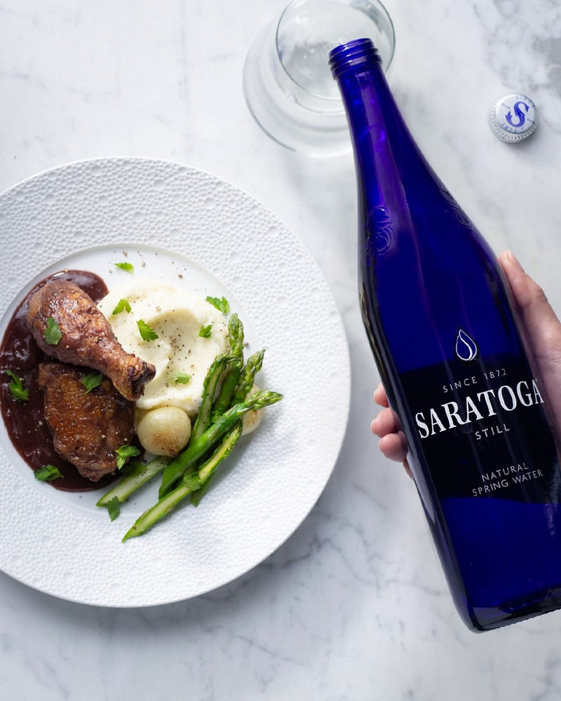 The delicious, rich sauce with its red wine base, the creaminess of the mashed potatoes and the brightness of the asparagus make this Coq Au Vin a simply luxurious recipe. We recommend pairing this dish with Saratoga Still Water. The low minerality and smooth texture of Saratoga® Still will balance the rich notes of the red wine sauce, and allow your palate to experience the depth of flavor.