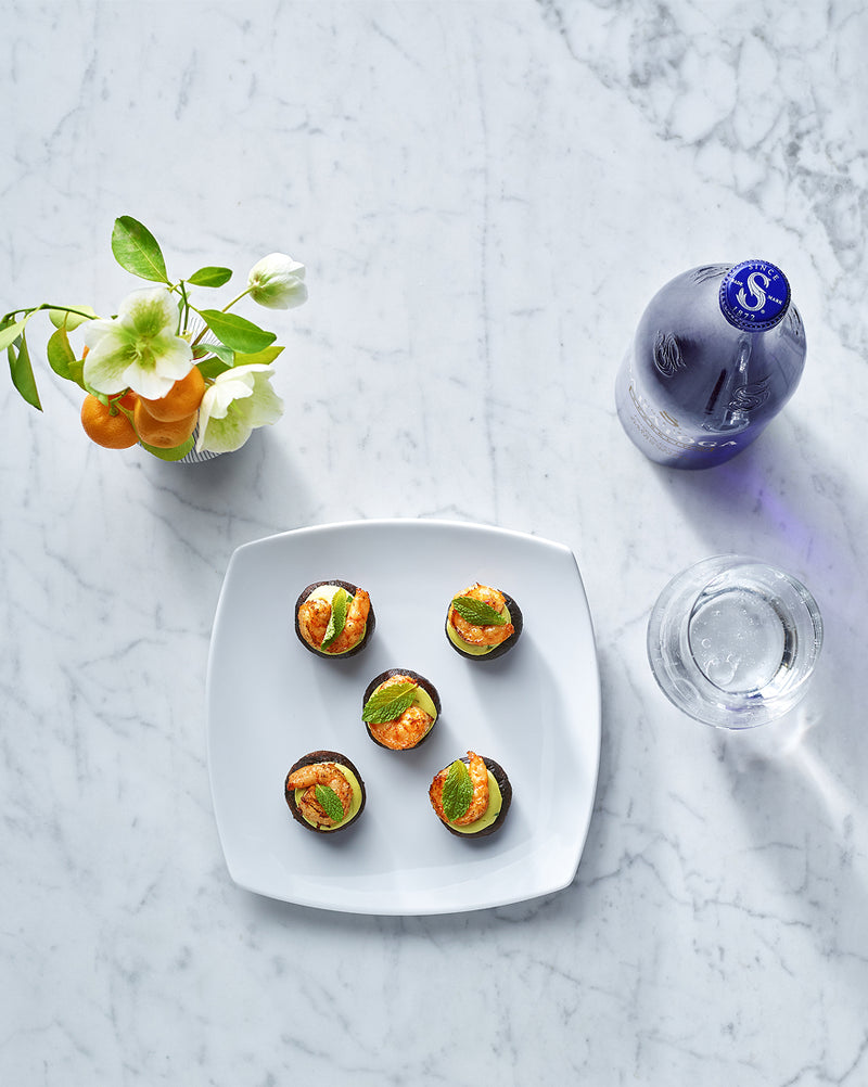Umami flavors from the mushroom caps and the rich creaminess of the avocado are the perfect pairing with Saratoga® Sparkling Spring Water. The low minerality allows the shrimp to shine for this delicious appetizer.