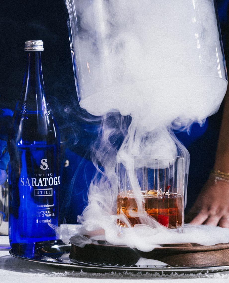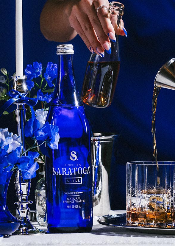 Instruction: Mix the bourbon, simple syrup, bitters, and Saratoga® Still Water with ice in a glass and stir. Garnish with a maraschino cherry. Wink. Blow yourself a kiss in the mirror.